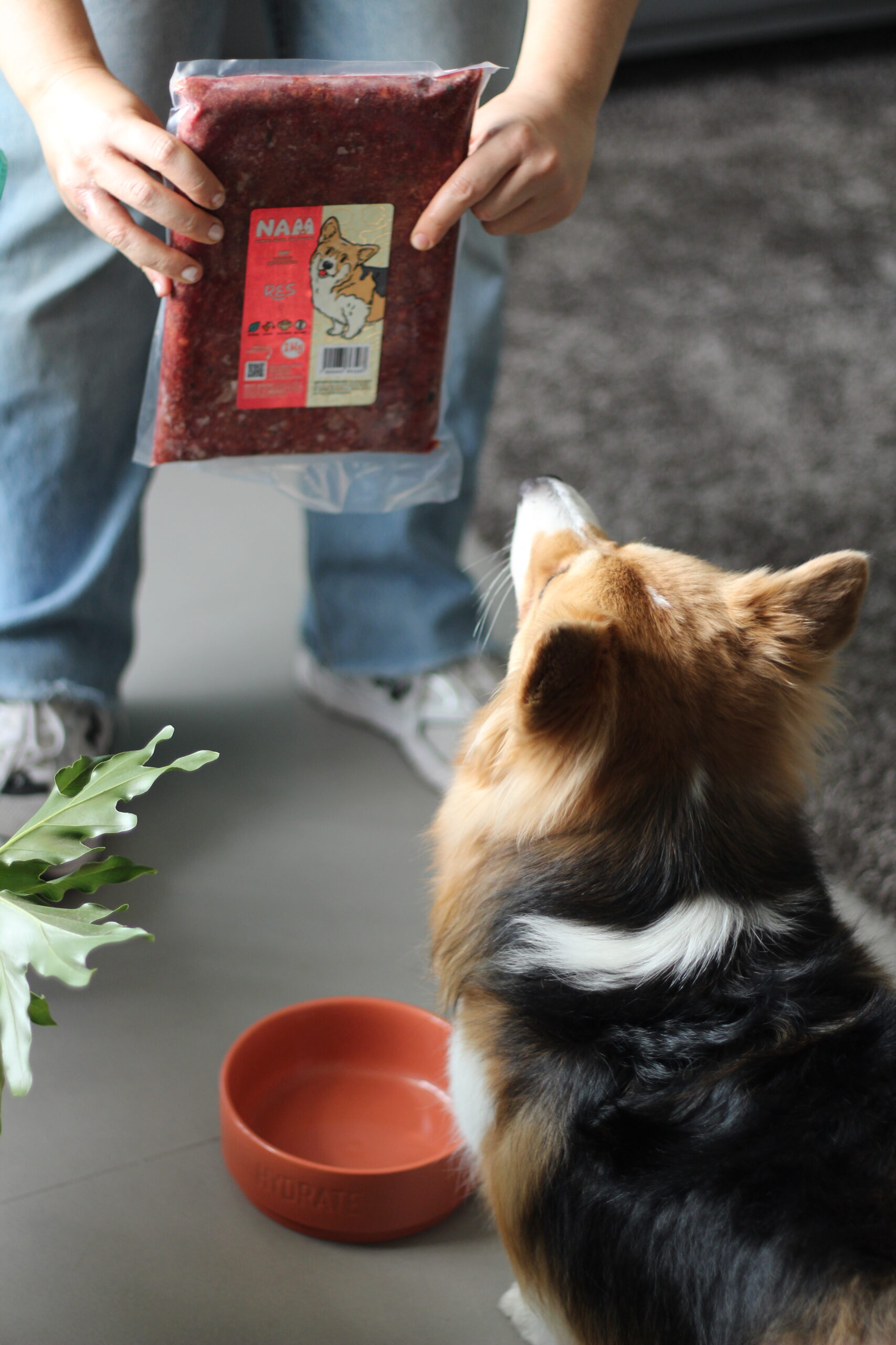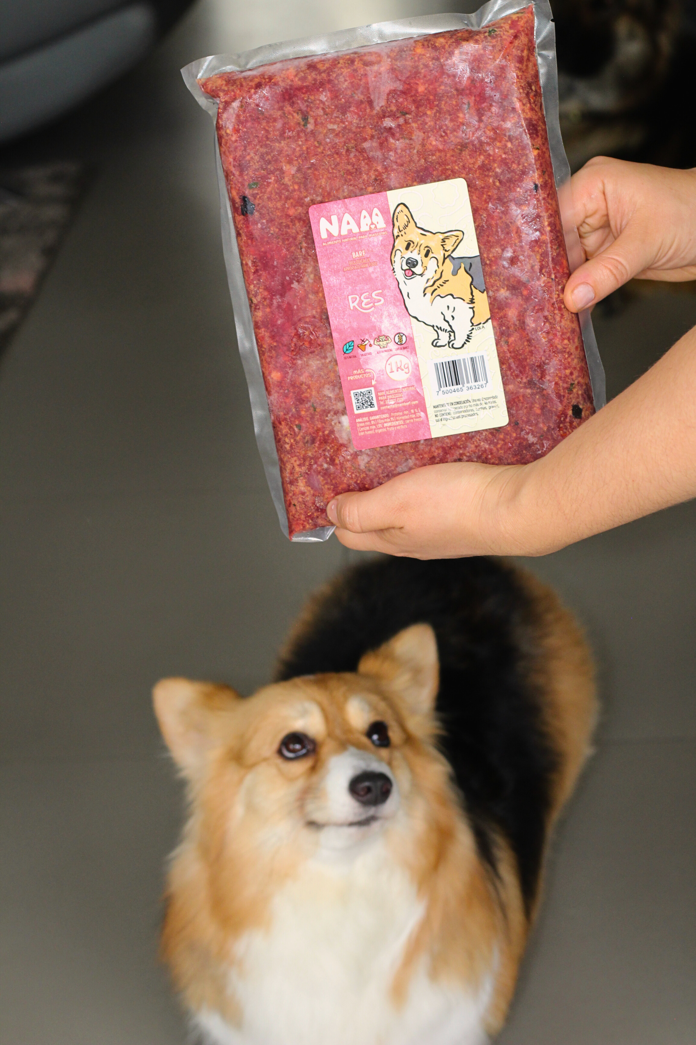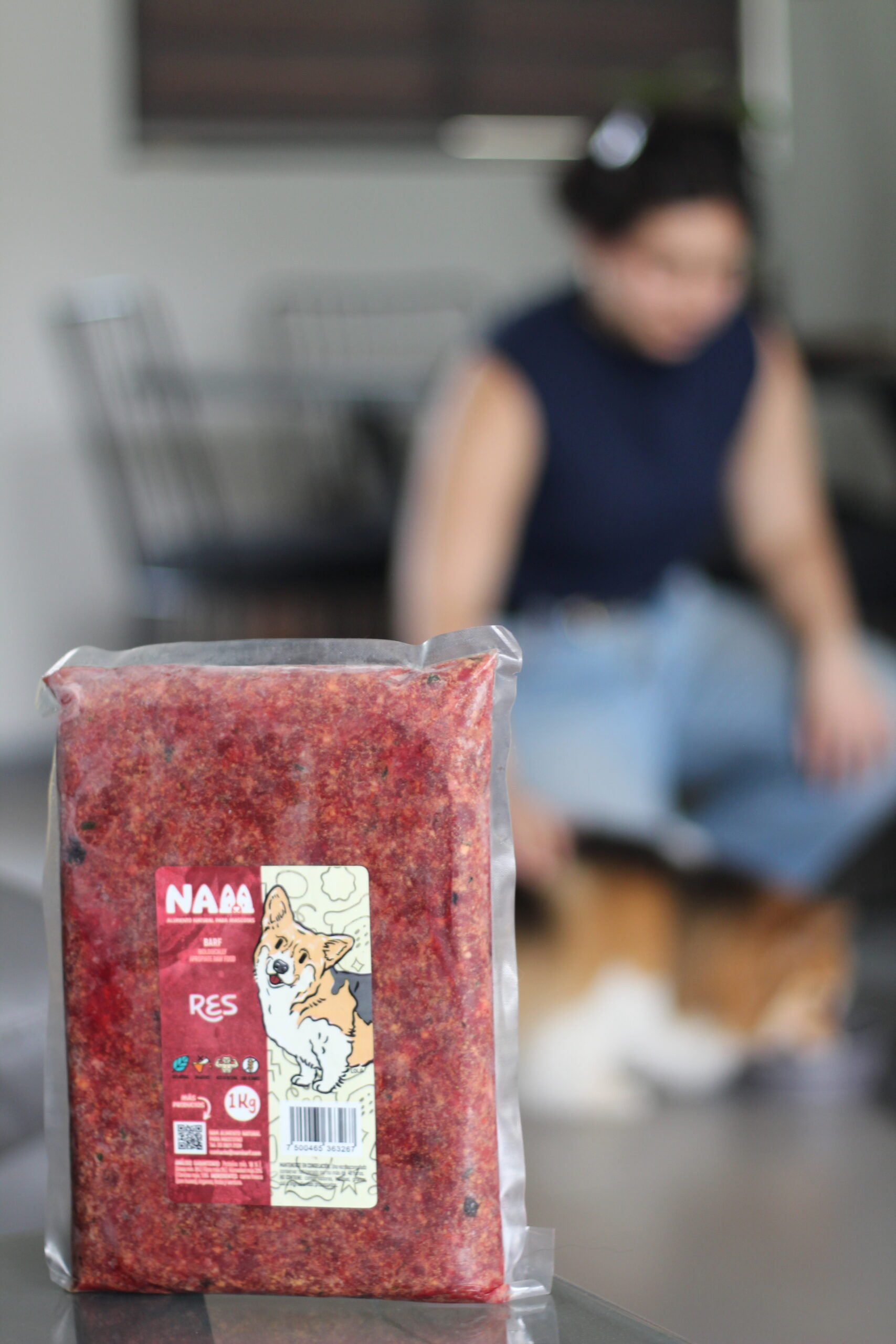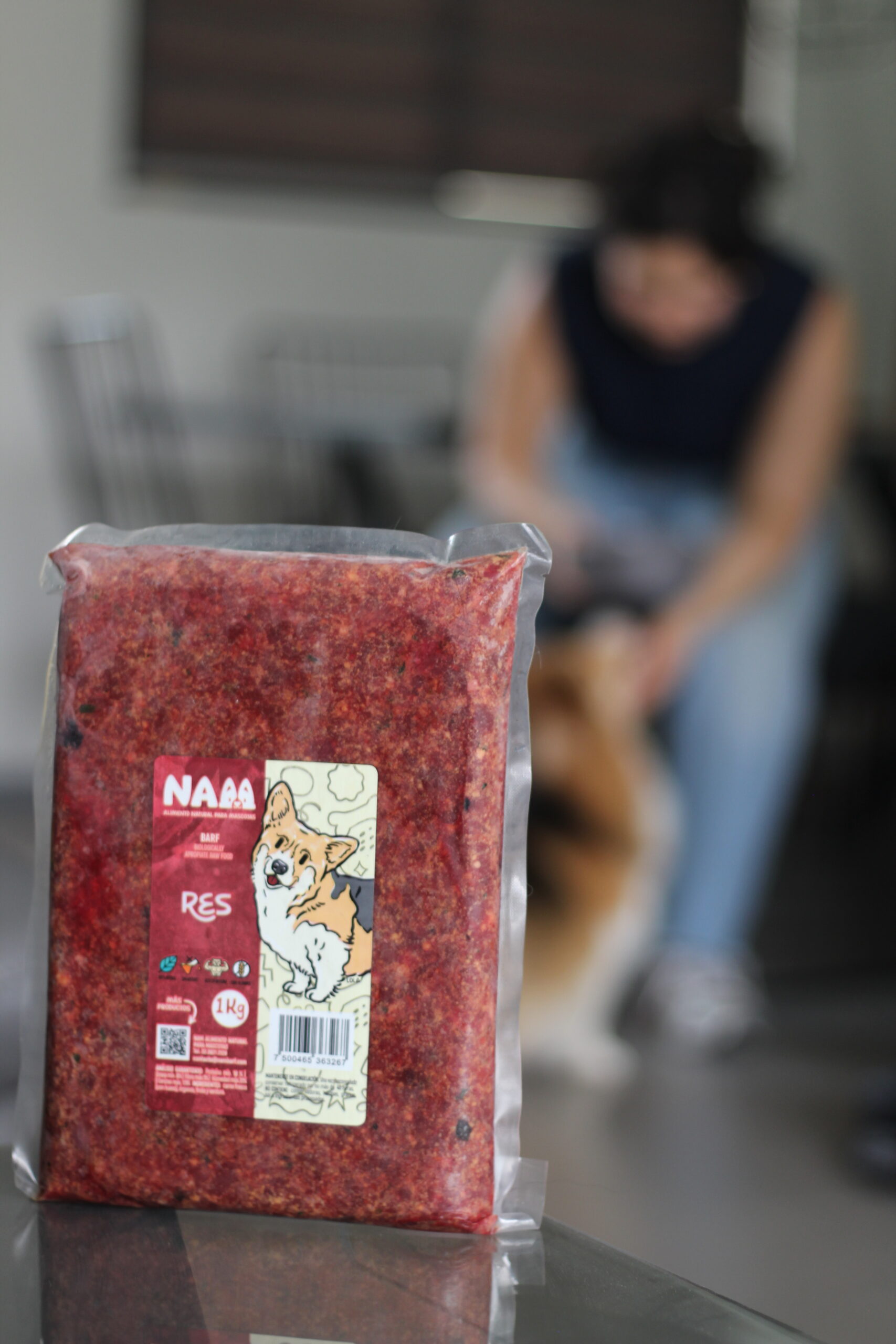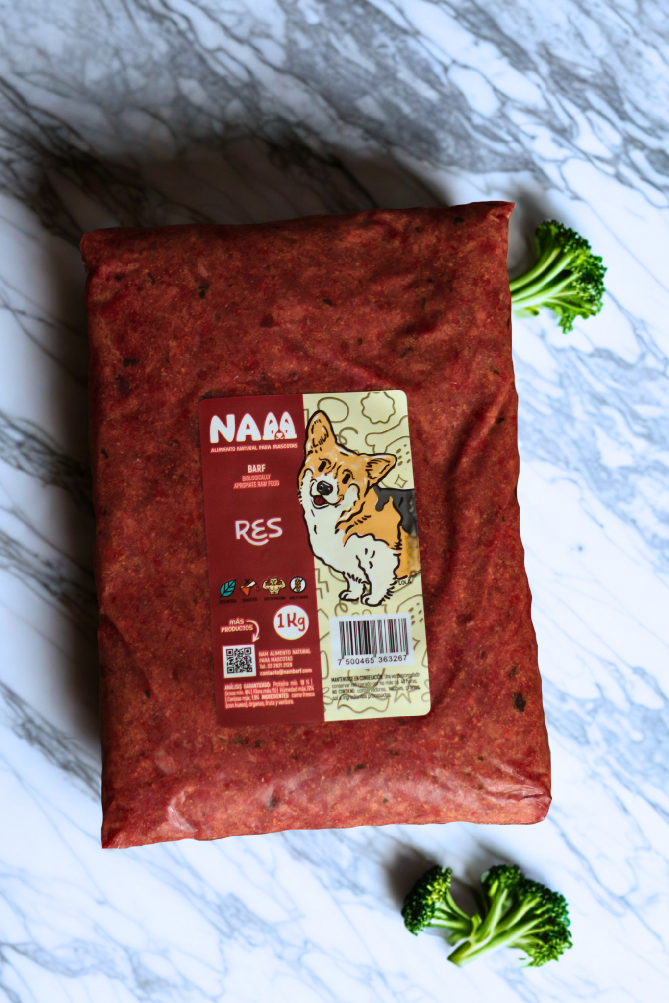 Alimento natural crudo congelado, elaborado con carne res de alta calidad, huesos carnosos, vísceras, frutas y verduras.